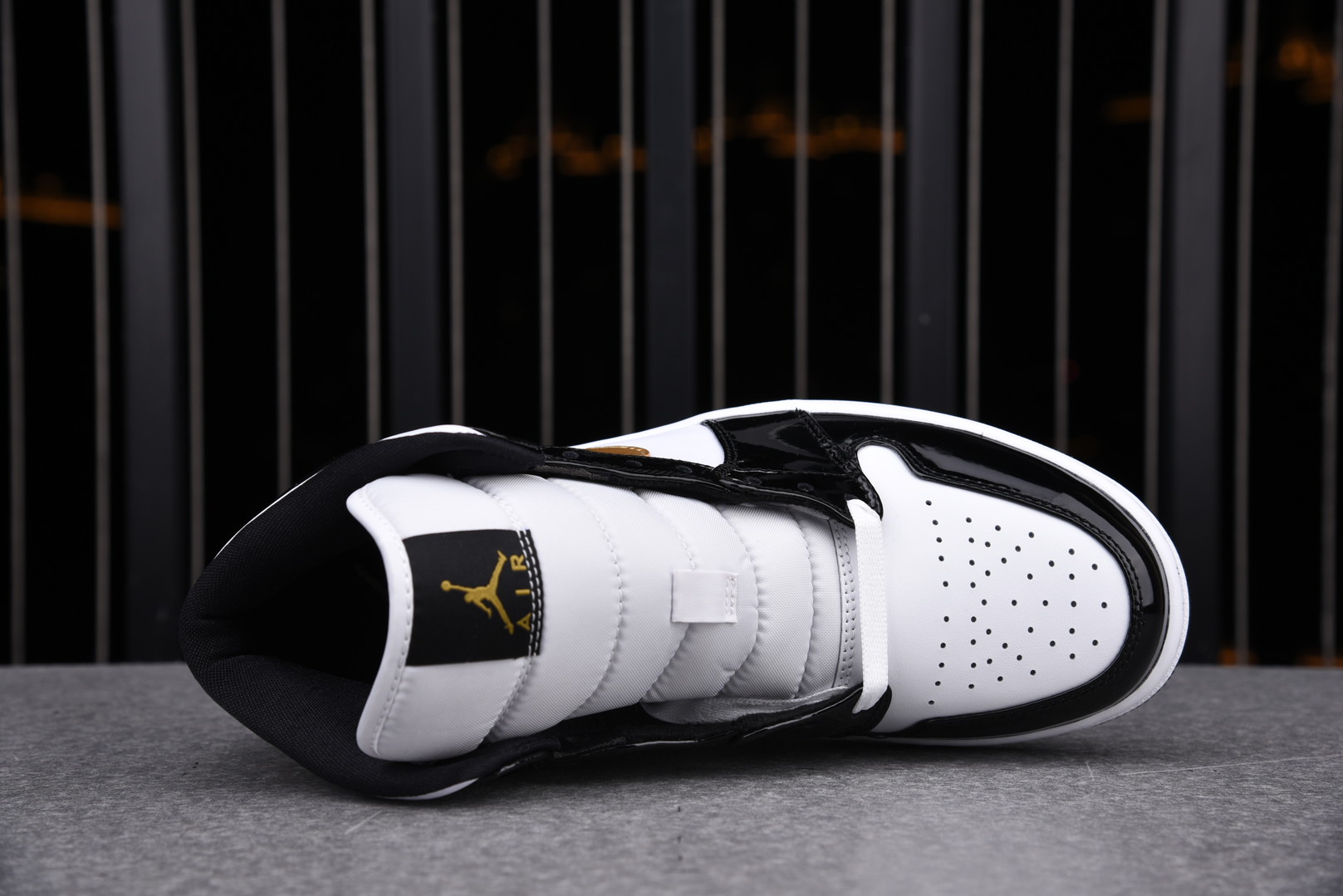 Jordan 1 Mid Patent Black White Gold